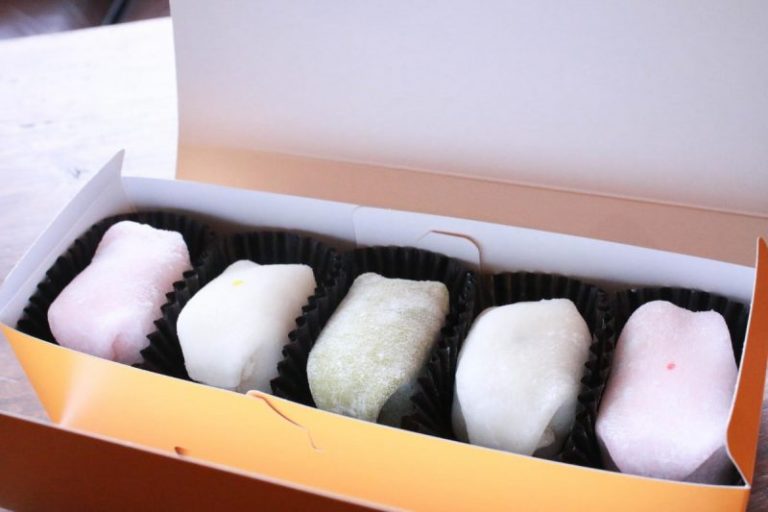 うれし庵の「もちもっち」(5個1,177 円)は、ムースとスポンジケーキが求肥(ぎゅうひ:粉に砂糖や水飴を加えて練りあげたもの)に包まれた新感覚のお菓子です。