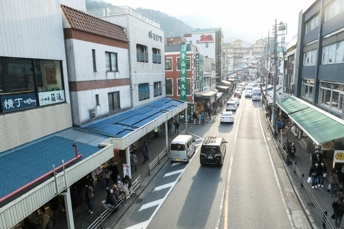 箱根湯本駅前には温泉饅頭やお土産屋、飲食店などが並ぶアーケード街が続きにぎわっています。