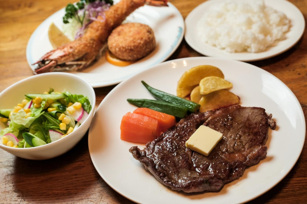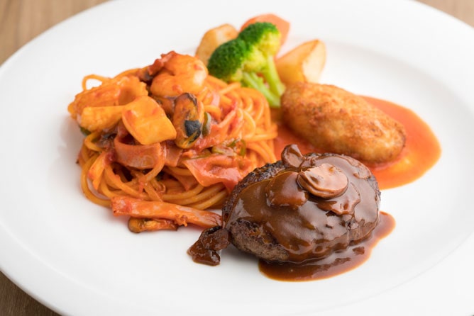 ランチにはハンバーグやスパゲティナポリタンなど昔懐かしい洋食がプレートになった洋食盛り合わせプレート(2,200円)がおすすめです。