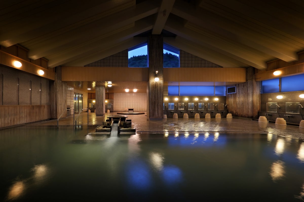 大浴場は御影石造りのほか、檜(ひのき)の露天風呂や上がり湯とそれぞれ趣の違う3種類の温泉があり、日によって色が変わる自家源泉の湯が使用されています。