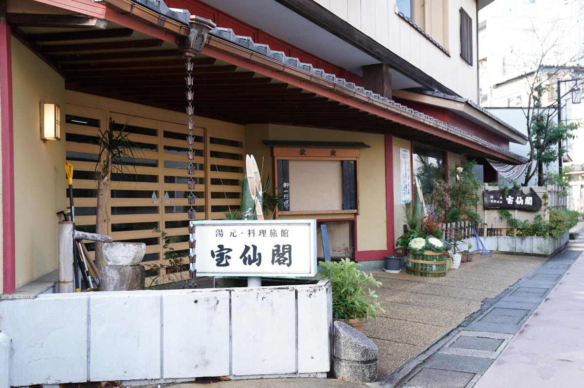 湯元を訪れた後は「味な宿 宝仙閣(ほうせんかく)」で温泉を満喫します。