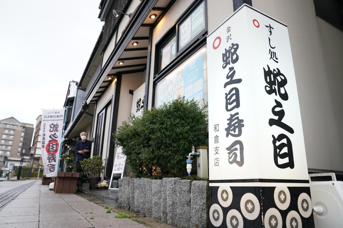 和倉温泉の中心あたりに位置する「蛇之目(じゃのめ)寿司」。近くには源泉が湧き出る湯元の広場などの名所があります。