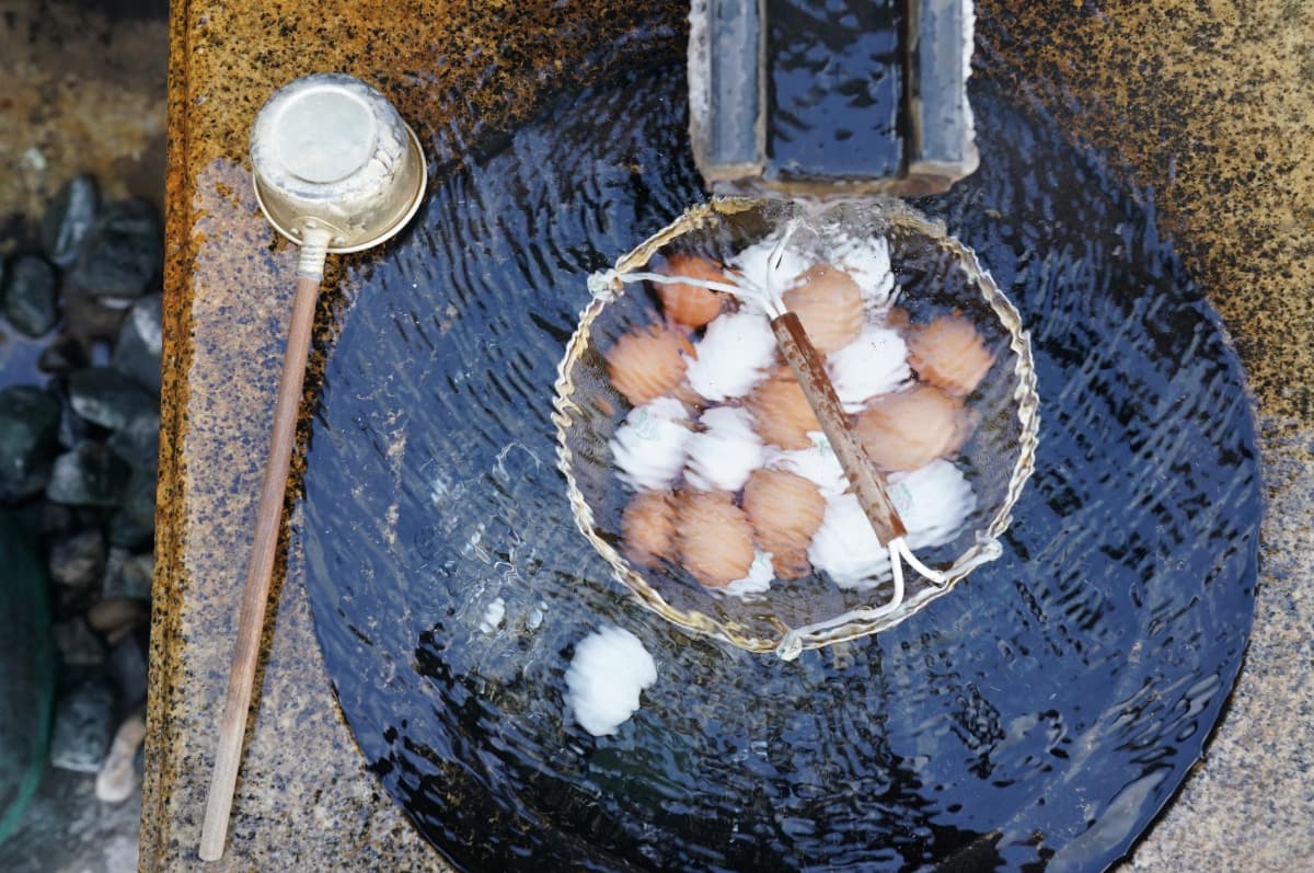 白鷺像の真ん中には、源泉が湧いており、温泉卵を作ることもできます。