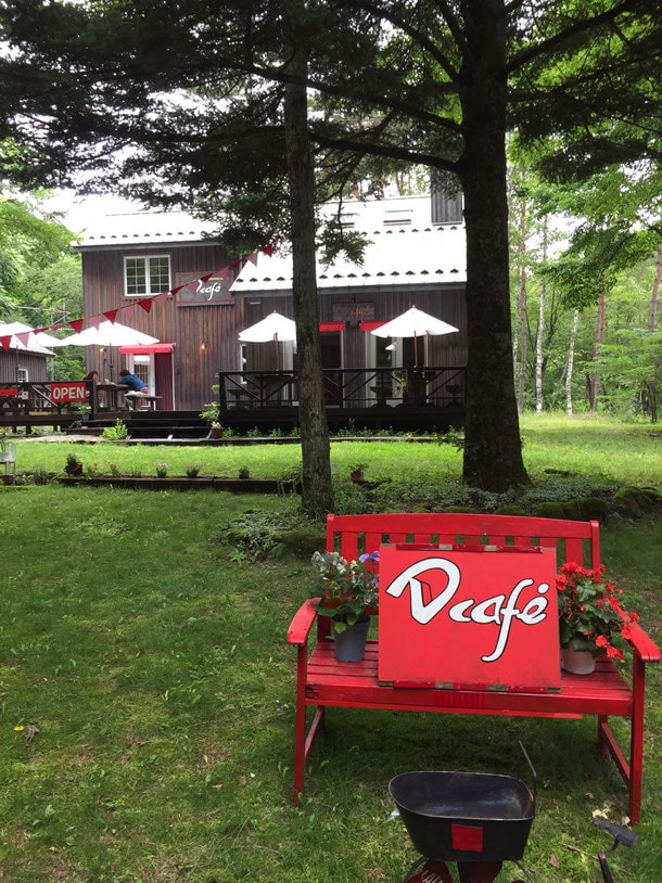 おしゃれなログハウスのカフェ「D-Cafe(ディー・カフェ)」。