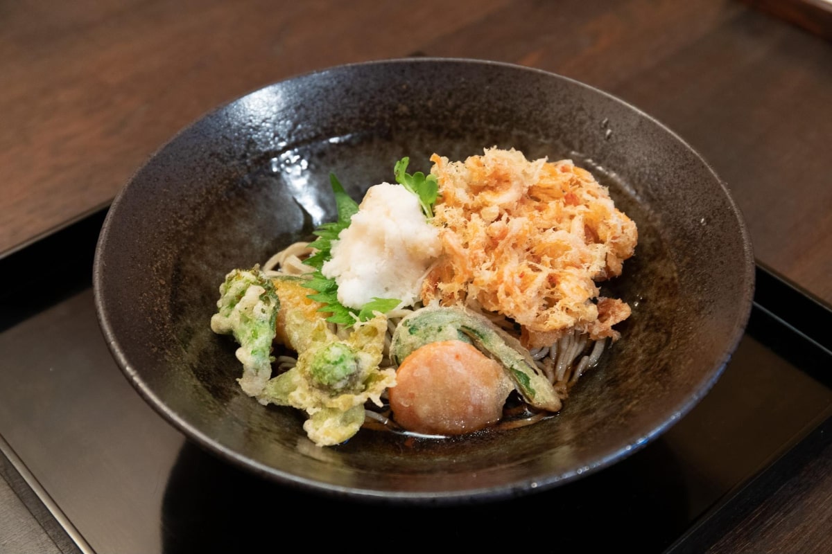器にそばとそばつゆ、その上にかき揚げと野菜の天ぷら、辛味大根おろしが盛り付けられています。