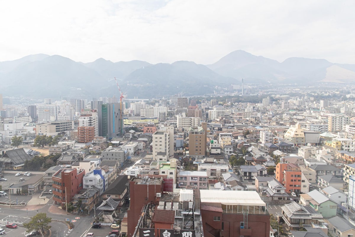 真下に広がる別府の街並みはレトロな雰囲気で、その奥には標高1,375mの鶴見(つるみ)岳が確認できます。