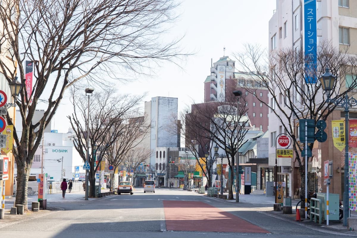 別府駅前から美術館へ続く道には、多くの飲食店やホテル、お土産屋が軒を連ねています。