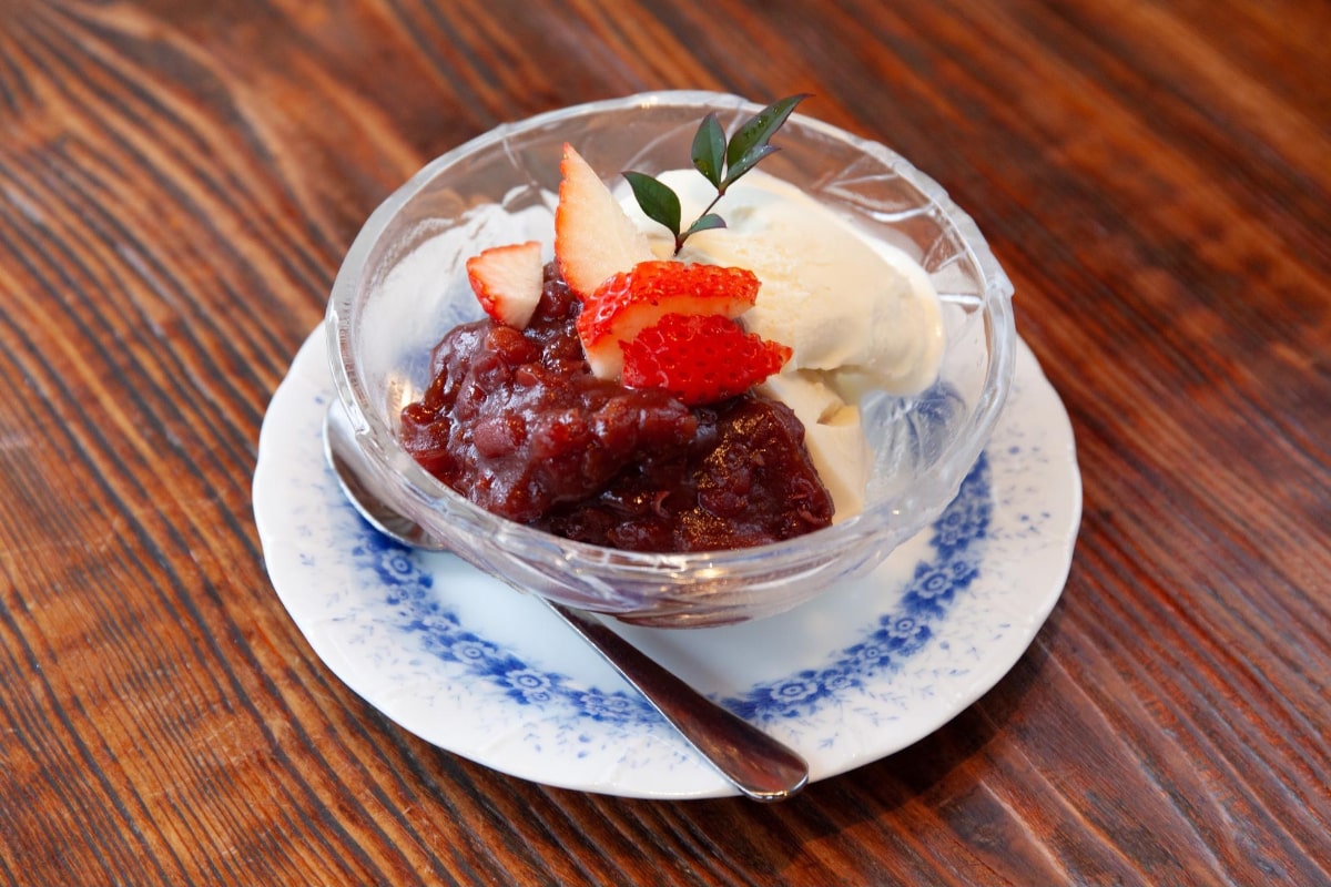 あんみつは甘さ控えめながらも濃厚な餡に、バニラアイスの甘さが引き立ちます。季節によって変わるフルーツは、甘酸っぱさを与えてくれて、程よい甘さで味わえます。