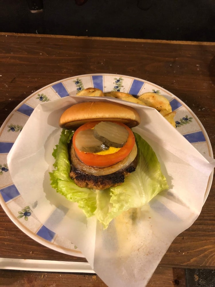 ジューシーなパティに、大き目のトマトやピクルスが盛り付けられ、食べ応えがあります。