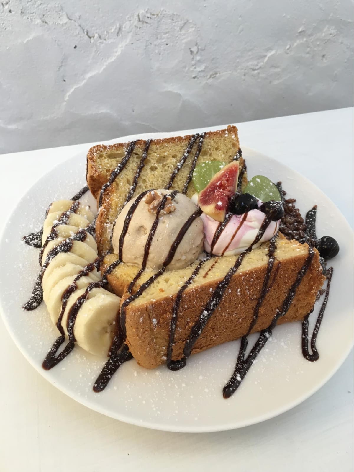厚切りトーストにバナナなどのフルーツやアイスが盛られ、その上からチョコやパウダーシュガーがトッピングされています。