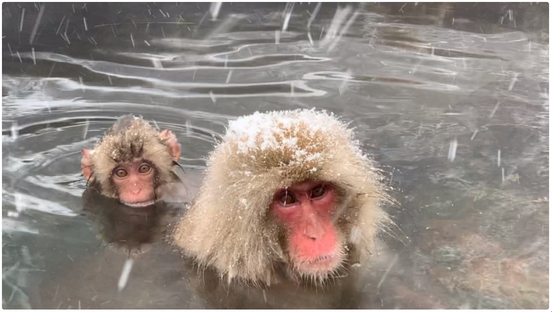 標高およそ850メートルの山間部に位置する地獄谷は、気候環境が厳しいエリアです。なんと1年のうち約4か月が雪に覆われています。「温泉に浸かる」という行為は、寒さをしのぐためにニホンザルが覚えた知恵なのです。