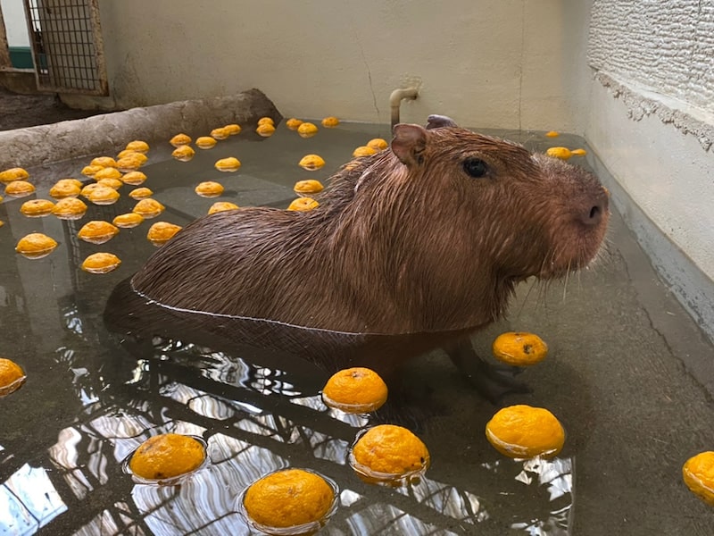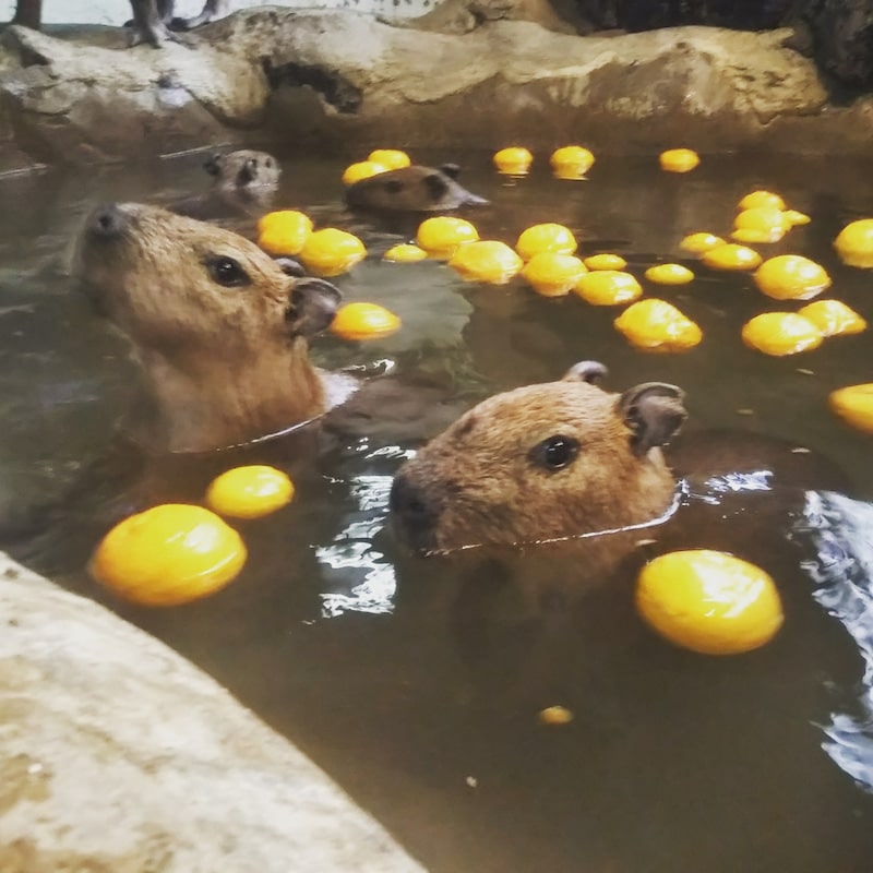 草津といえば、やっぱり温泉。カピバラたちも温泉が大好きです。草津熱帯圏に行ったら、温泉に浸かってしっとりしているカピバラファミリーの姿を楽しみましょう。カピバラ温泉はゆず湯になることもあり、風物詩としても有名です。