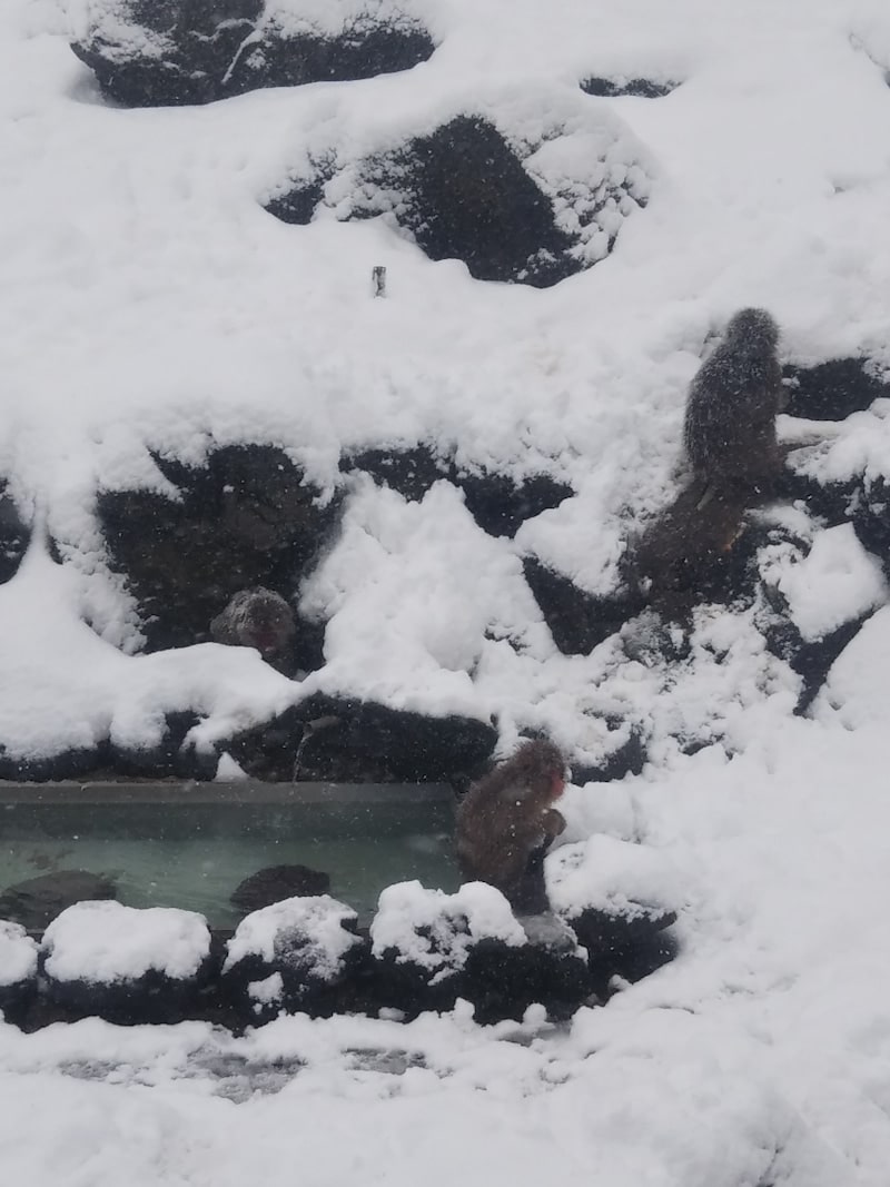 屋外のサル山で暮らすニホンザルたちのためには、ぜいたくな露天風呂が用意されています。冬になれば、降りしきる雪の中で温泉に浸かりまったり過ごす姿が見られるかと思いきや、温泉に浸かるより湯気にあたってあたたまる方が好きだとか。微笑ましいですね。