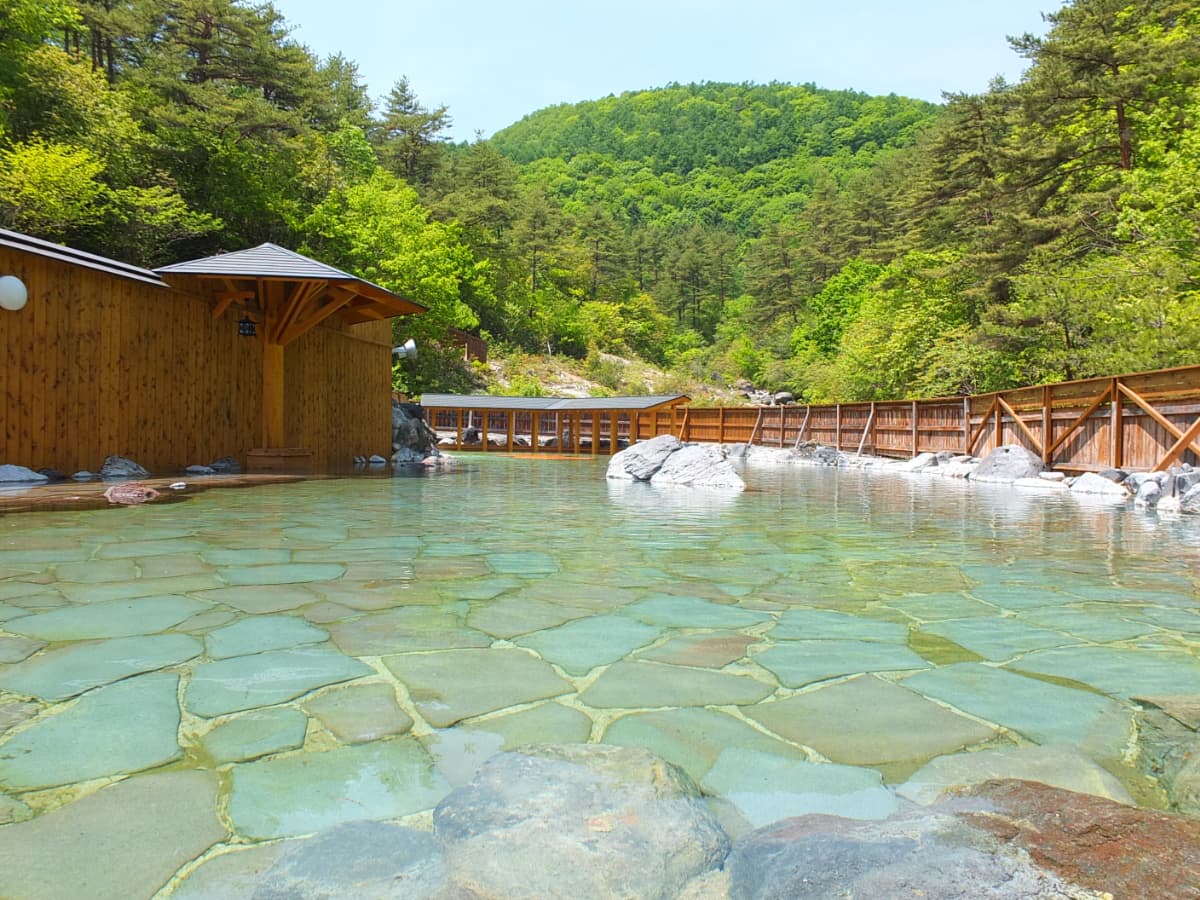 河原に温泉が流れている公園で、綺麗な緑色をした池があります。一番の魅力は、500平方メートルの大露天風呂。草津温泉の中で一番広い露天風呂です。夏は緑に囲まれ、自然の魅力を堪能しながらリラックスできます。