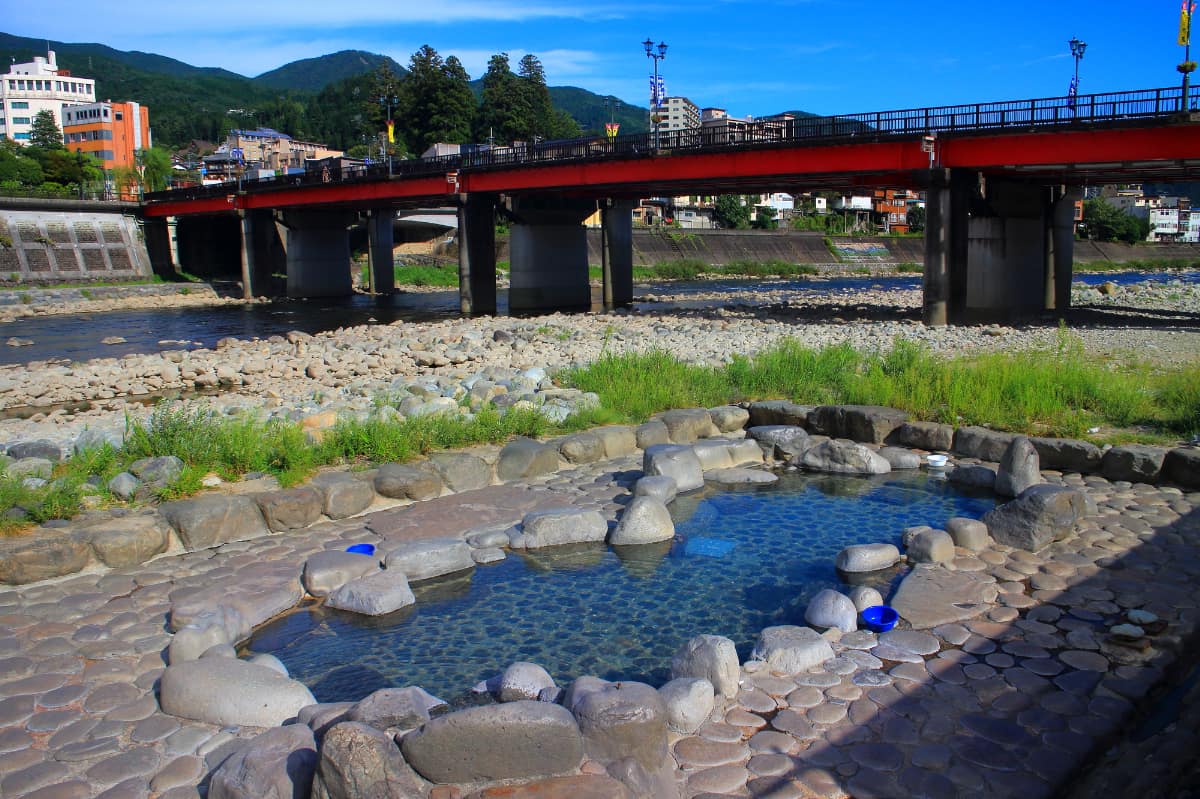 「噴泉池(ふんせんち)」は、飛騨川のせせらぎをバックに下呂温泉の源泉を堪能できる無料の野外温泉です。一切囲いもなく開放感が抜群で下呂温泉名物の一つとなっています。温泉街のどまん中にあり毎日多くの人が利用しています。