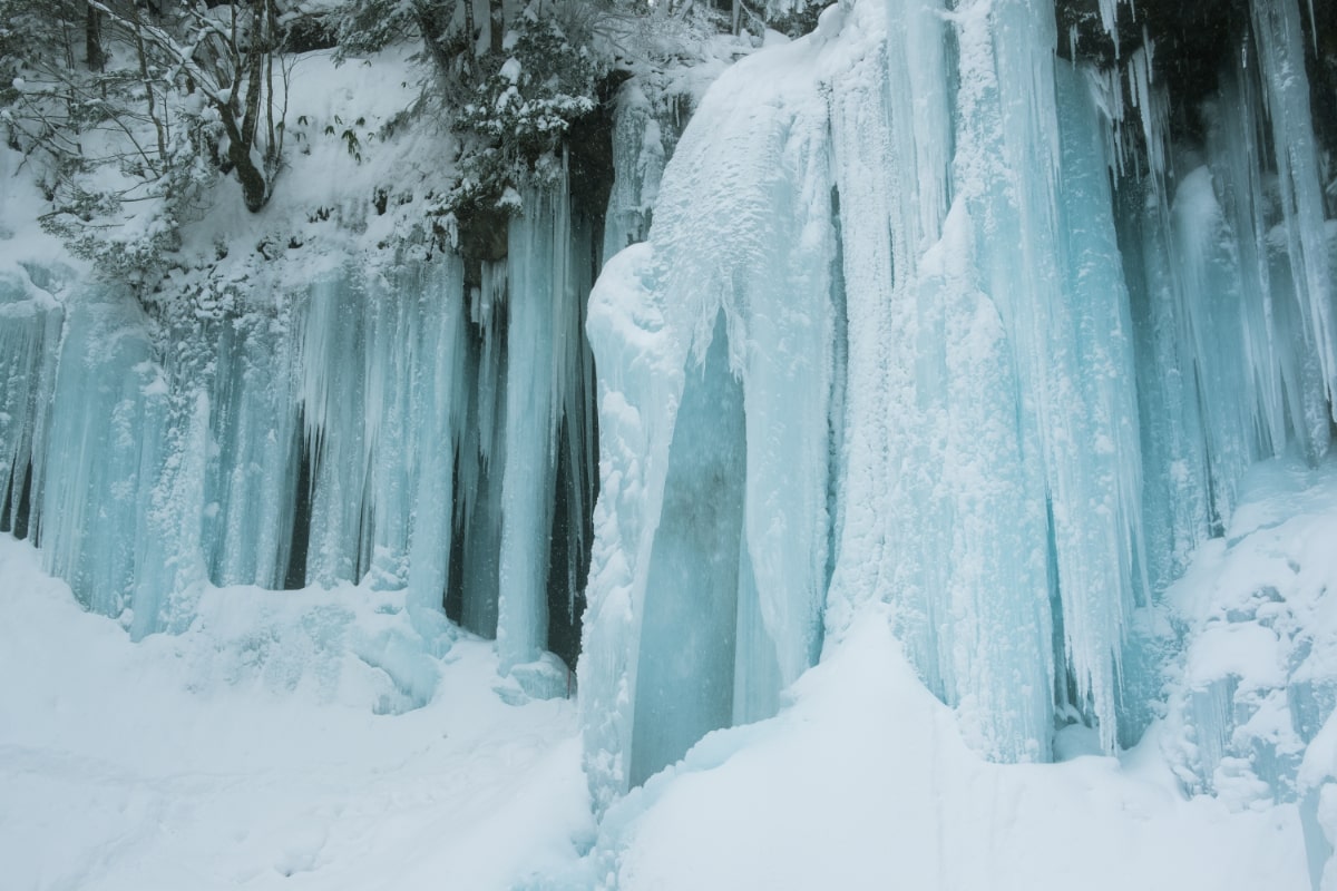 下呂温泉駅から車で約30分の「小坂(おさか)町」には、落差5m以上の滝が200数箇所あります。滝めぐりのコースはさまざまありますが、中でも人気なのは、2月上旬から3月中旬が見頃の巨大な氷のアート「氷瀑(ひょうばく)」を見るガイド付きツアー。気温はマイナス15度ほどになる極寒の地で作られる氷瀑は、見上げるほどに大きく育ち、まるで氷の神殿を思わせます。それぞれ形や色も違う氷が作り上げるその蒼い幻想的な世界に圧倒されます。
