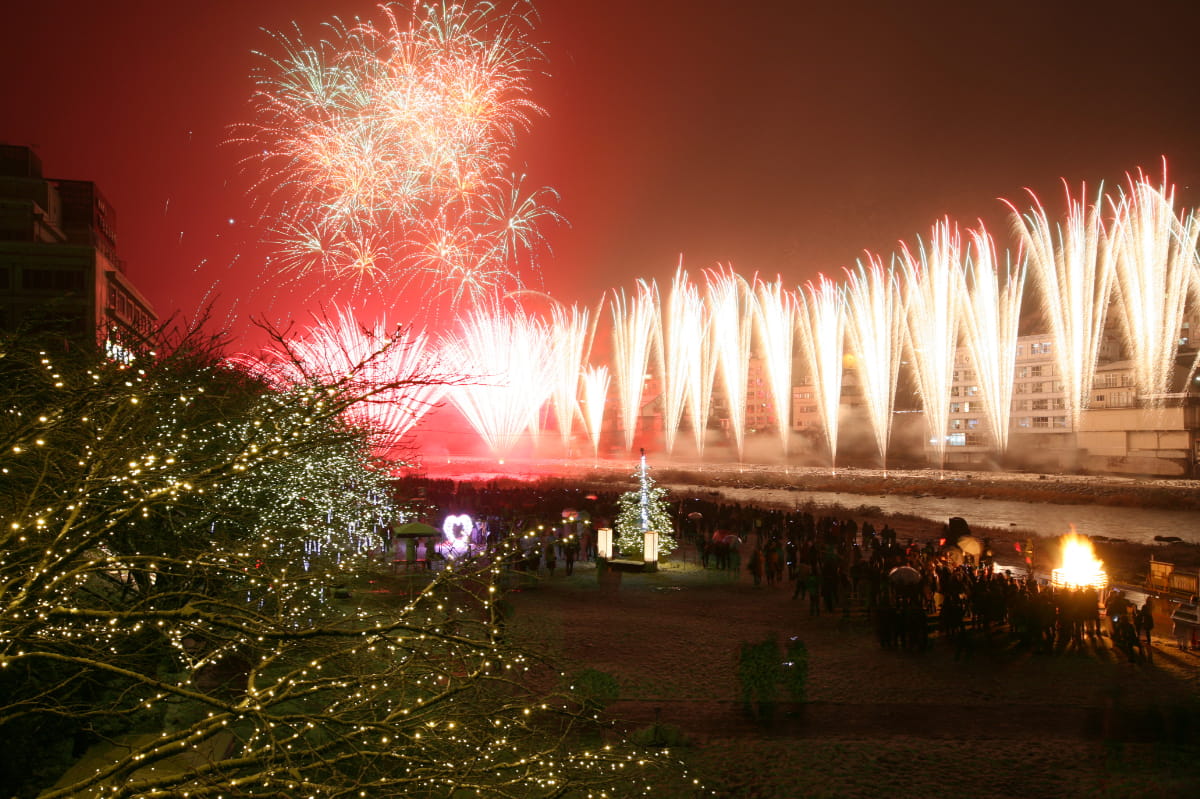 下呂温泉街では、10月から3月までの毎週土曜日(12月から3月は毎週日曜日も)の夜に花火が打ち上げられます。バレンタイン、お雛様など毎週変わる花火のテーマにも注目。温泉街の中心地から見られるので、夕食後の散歩ついでに楽しめます。下呂大橋の東側や阿多野谷(あたのだに)周辺が絶景の観覧スポットなので、早めに訪れて場所の確保をおすすめします。