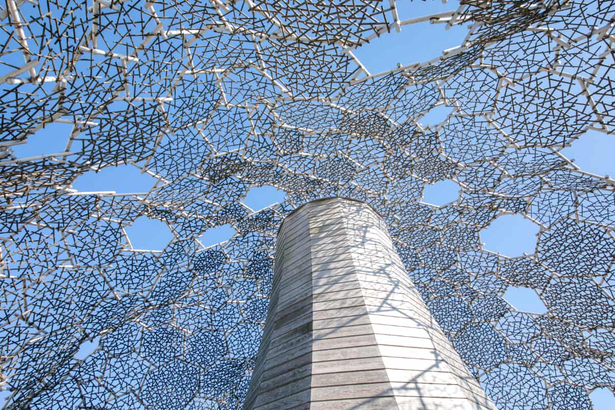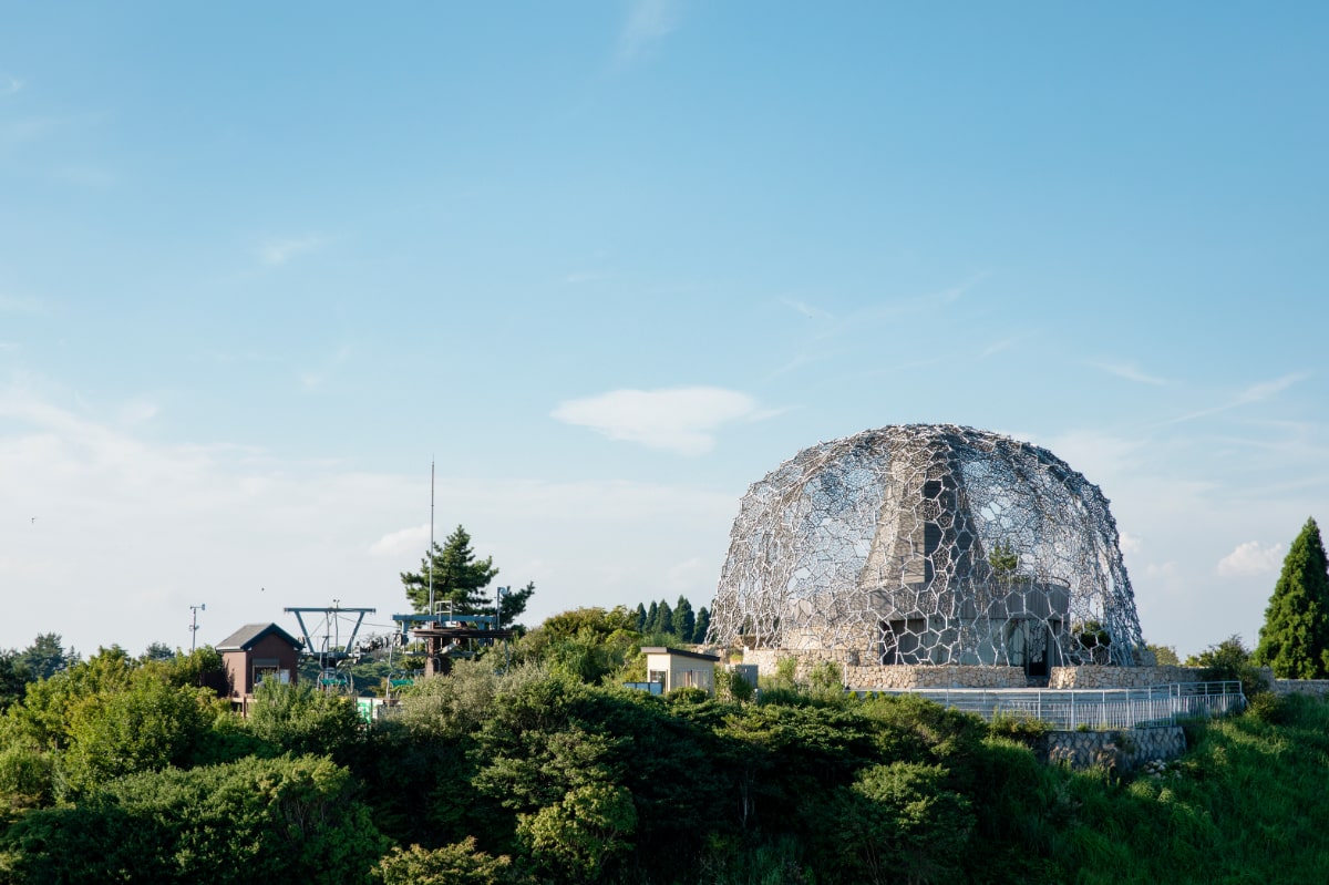 ロープウェーの山頂駅から徒歩5分にある、六甲山上ガーデンテラス内にある「自然体感展望台 六甲枝垂れ(しだれ)」(大人 320円 小人 210円)は、フレームや壁、床に全てヒノキを使った総檜葺き(ひわだぶき)のデザイン性の高い展望台です。檜葺きとはヒノキの樹皮を用いた屋根葺手法の一つです。