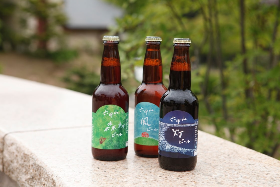 六甲山の地下50mの岩盤から汲み上げた天然水で醸造した地ビール「六甲山ビール」(660円)。六甲山嶺にある工場で、材料から製法までこだわって作り上げたビールは、飲みやすい「風」(ピルスナー)、苦味の強い「森」(インディアペールエール)、黒ビールの「灯」(ポーター)の3種の味わいがあります。