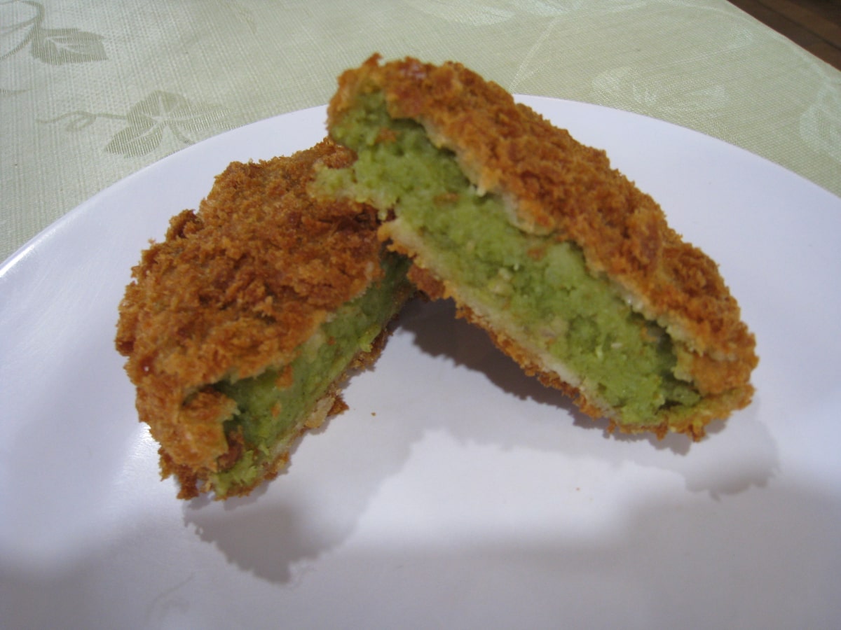 コロッケを割ると中はしっかりワサビ色ですが、ツーンとくるほどは辛くなく、ピリッと絶妙な辛さに仕上がっています。熱々揚げたてをぜひお試しください。