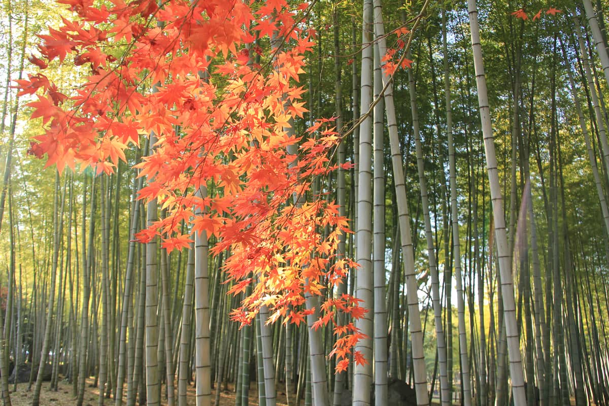 桜の名所としても知られていますが、秋には美しい紅葉やキンモクセイの花の香りを楽しむことができます。その中でも特に「モミジバフウ」の鮮やかな紅葉や竹林ともみじの共演は必見です。