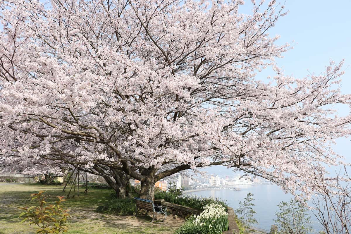 別府湾を背にして咲くピンクの桜と別府湾の青い色のコントラストが美しく、カメラを向ける人の姿が絶えません。春に必ず訪れたい名所のひとつです。