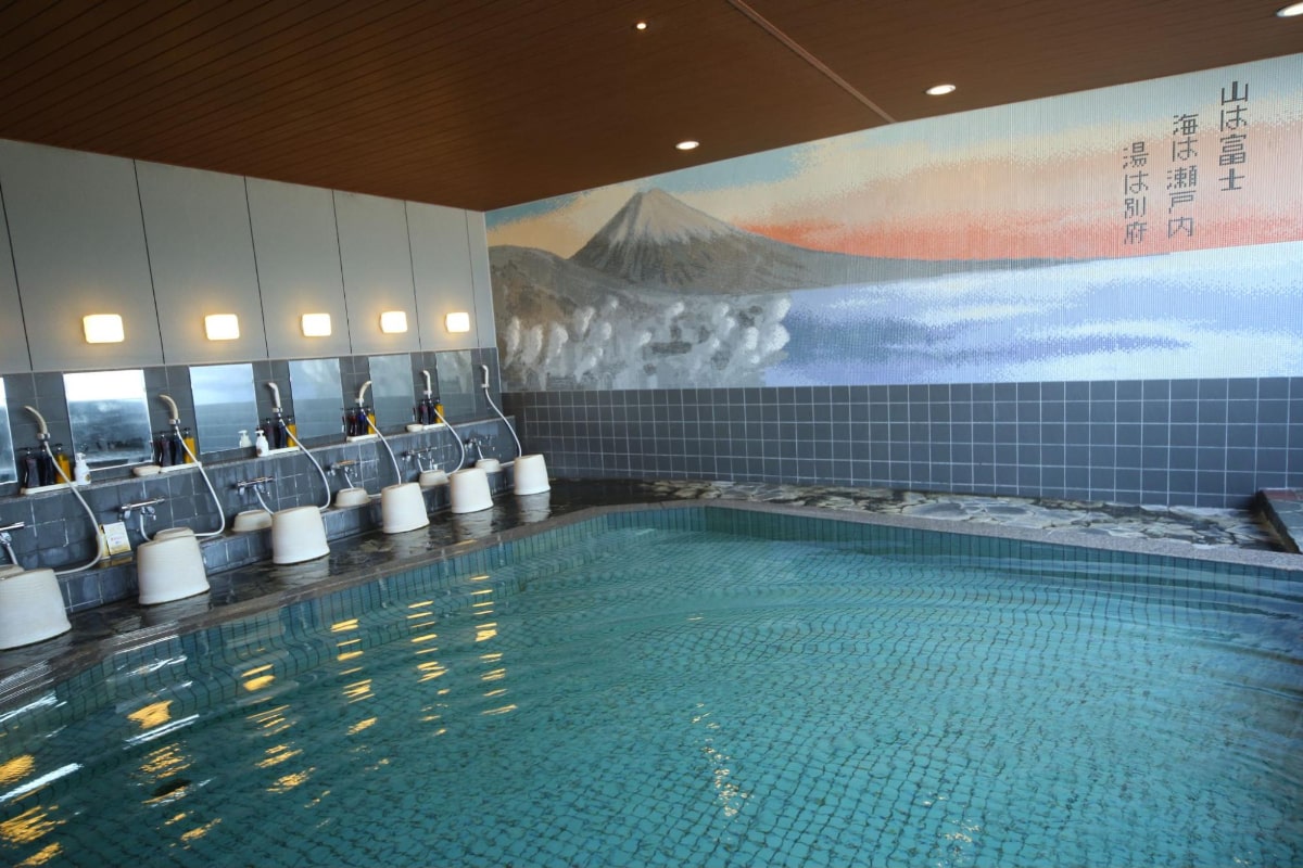 別府観光の父と言われた油屋熊八さん考案の「山は富士、海は瀬戸内、湯は別府」にあやかり、男性浴場にはモザイクタイルで別府湾の向こうに浮かぶ富士山を描いています。こちらもご好評いただいております。