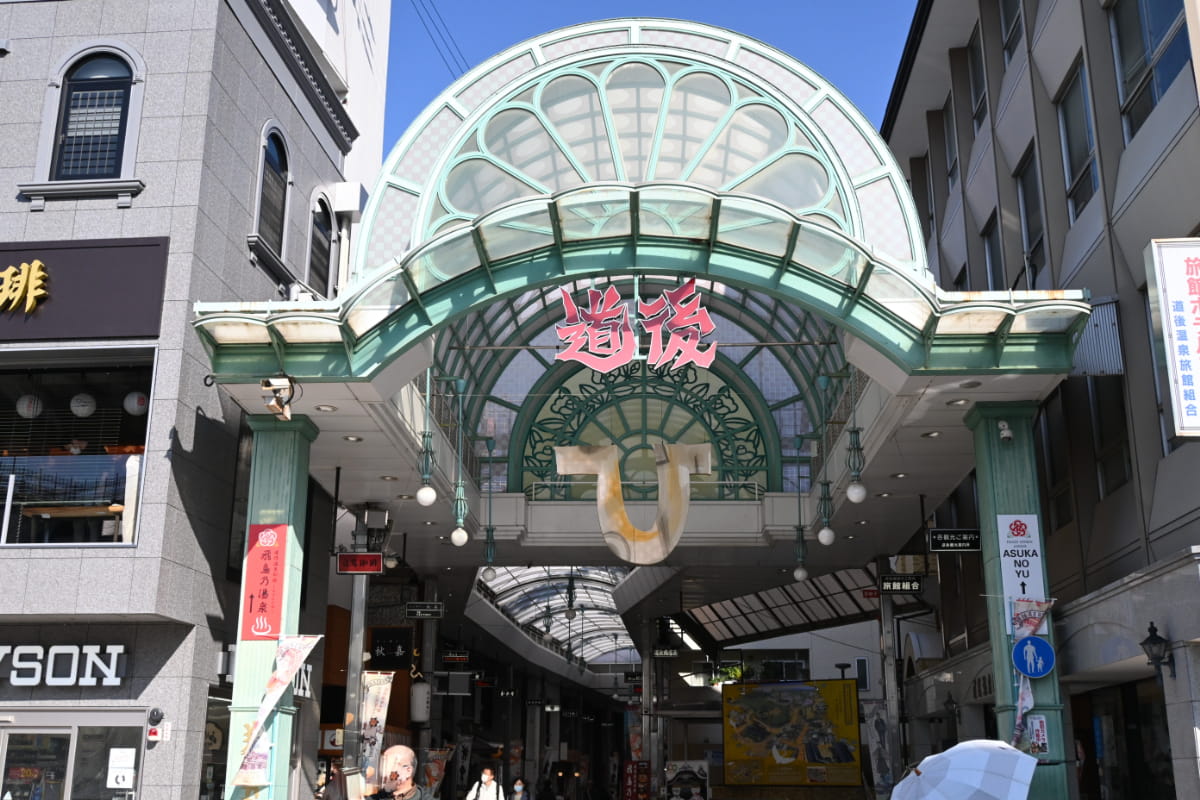 「ハイカラ通り」と呼ばれ親しまれている道後商店街は、伊予(いよ)鉄道の路面電車の終点「道後温泉駅」から共同浴場「道後温泉本館」を結ぶ約250mのアーケード街。