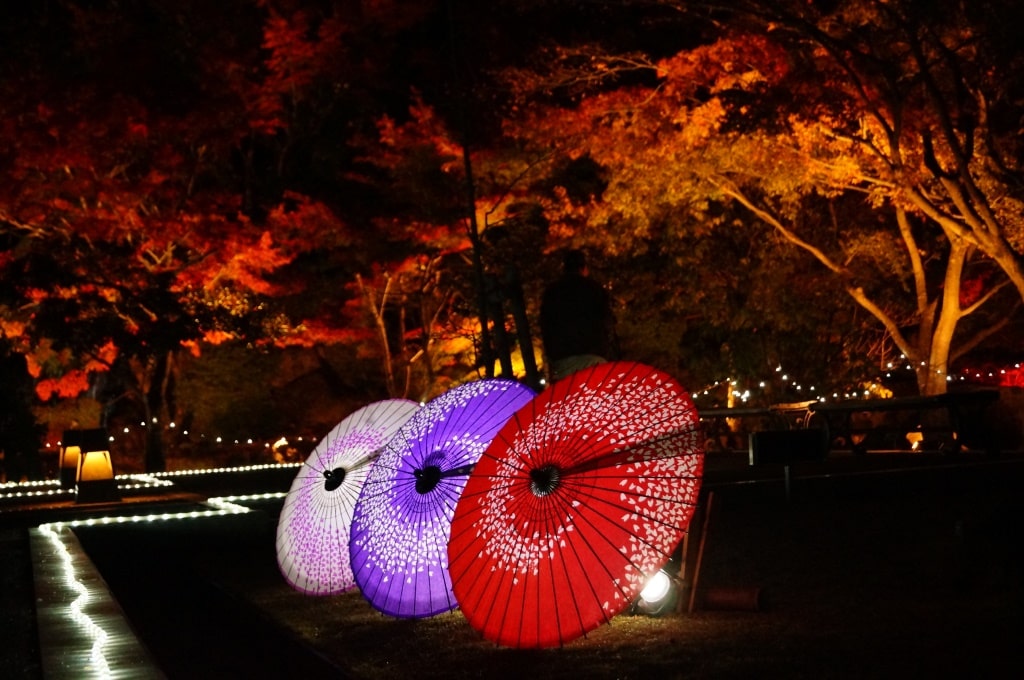 麓にある「二之丸史跡庭園」では、11月下旬頃にもみじのライトアップ・庭園内イルミネーション「二之丸光の庭園」を鑑賞できます(17:00〜21:00)。