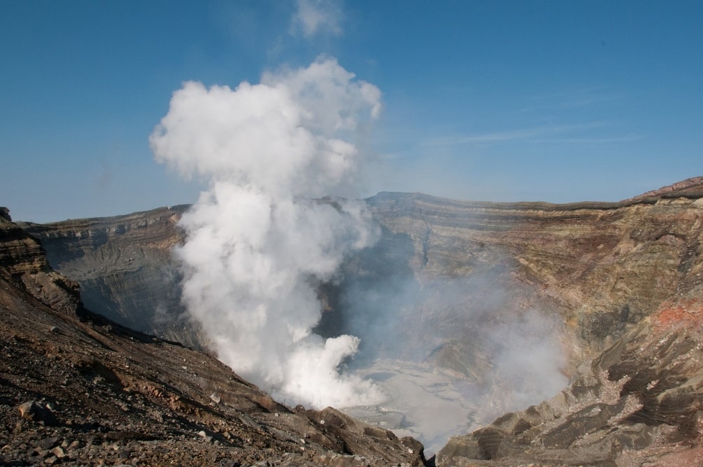 活発な噴火活動を続ける中岳。火口周辺では、溶岩が露出し白い煙がもくもくと立ち上がる、ダイナミックな息吹を間近に感じられます。ガス発生による登山規制もあるので、訪問の際は事前に確認をしてください。