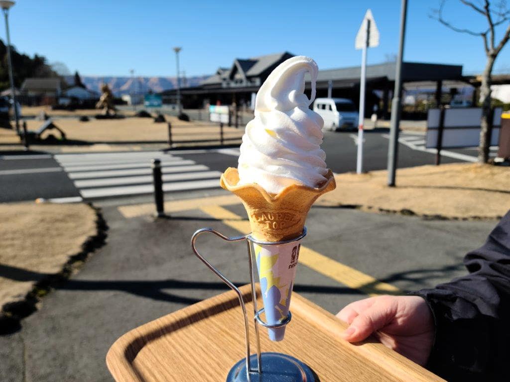 地元の牛乳を使ったソフトクリームは、「道の駅阿蘇(ASO田園空間博物館)」でも試して欲しいスイーツ。道の駅では、「阿部牧場のソフトクリーム」、「竹原牧場のソフトクリーム」(各400円)の2つの牧場がこだわって作ったソフトクリームを味わうことができます。