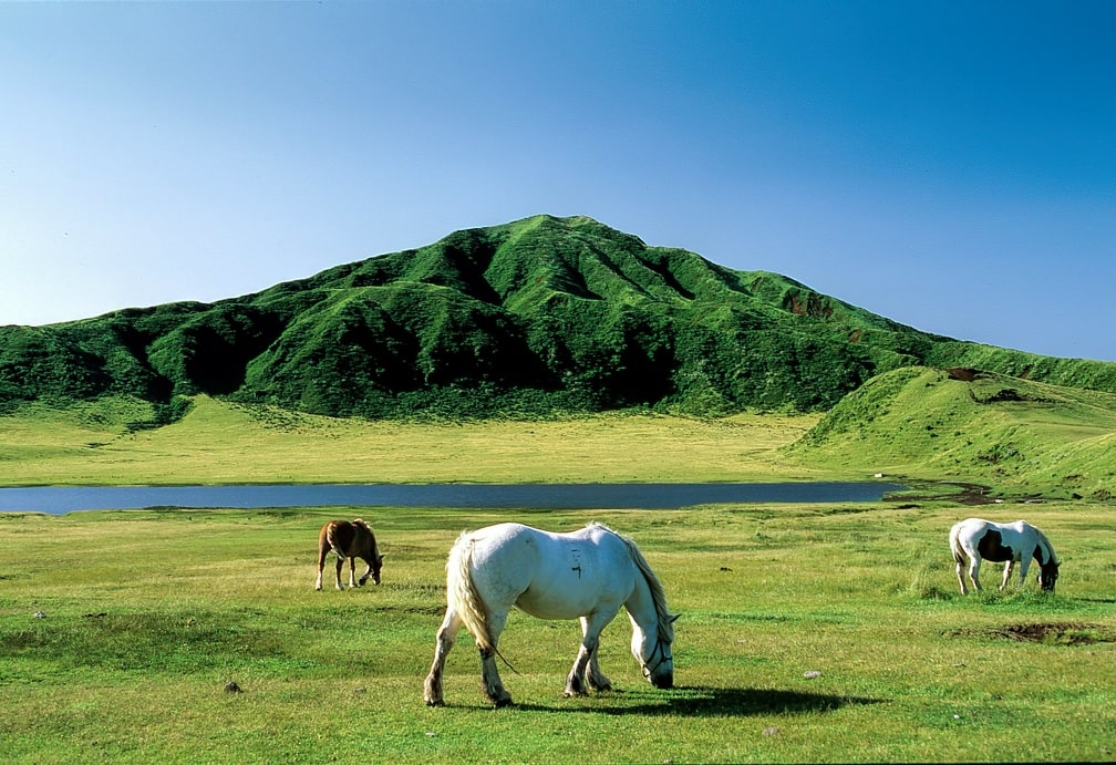 中央には大きな池があり、周りは低い火口壁に囲まれています。放牧馬がのんびりと草を食べている牧歌的な風景に心なごみます。