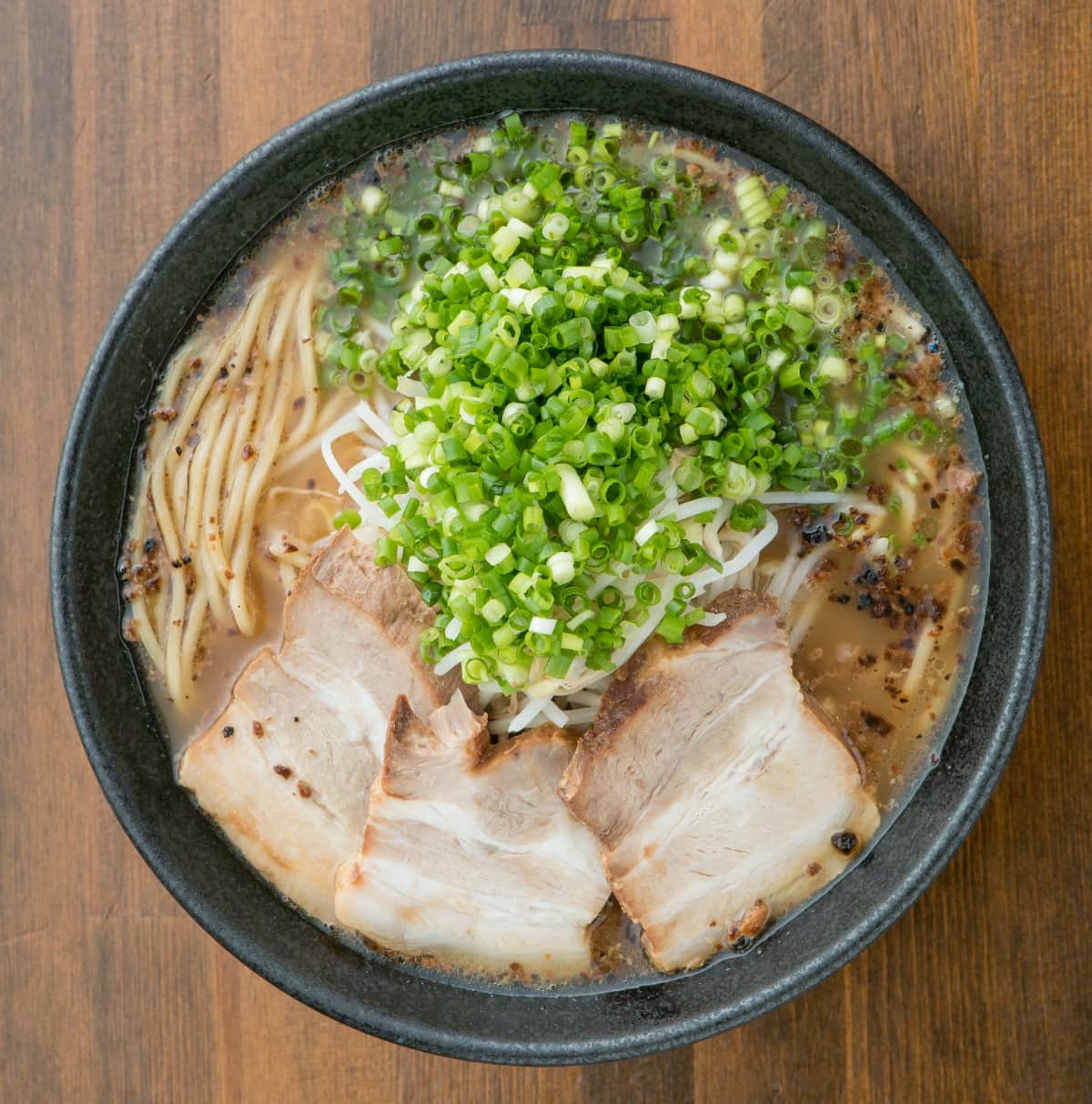 ニューヨークのラーメンコンテストで2連覇を達成した、豚骨ラーメンの名店「麺屋二郎本店」。創業以来、継ぎ足しで作っているチャーシューのタレと焦がしニンニクのスープのラーメン「焦がし豚骨かさね味」(900円)が人気です。