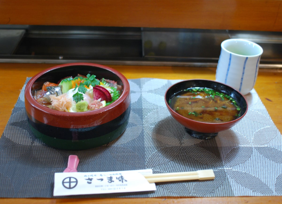 地産地消の割烹料理を提供する「さつま味」のいち押しランチメニューは、「板前まかない丼」(1,100円)。地元で上がったきびなごなどを中心に、10種類ほどの日替わりの魚介類をヅケにして乗せたボリュームのある丼です。