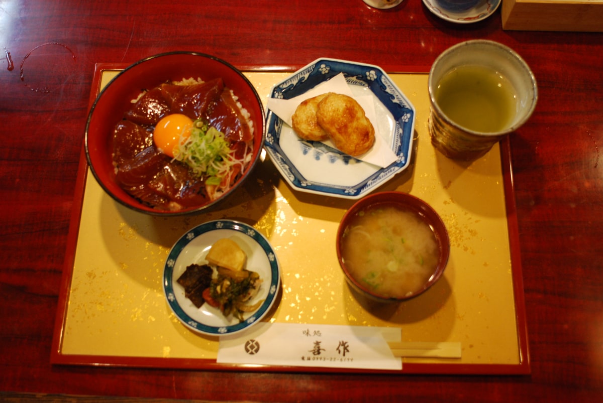 鹿児島県枕崎市であがった新鮮なカツオをヅケにしてたっぷりのせた丼は、喜作特製ごまだれやねぎ、卵黄が一層美味しさを引き立てます。噛むごとに甘みを感じる熱々のさつま揚げや鯛の出汁でとった味噌汁も滋味深い味わいです。