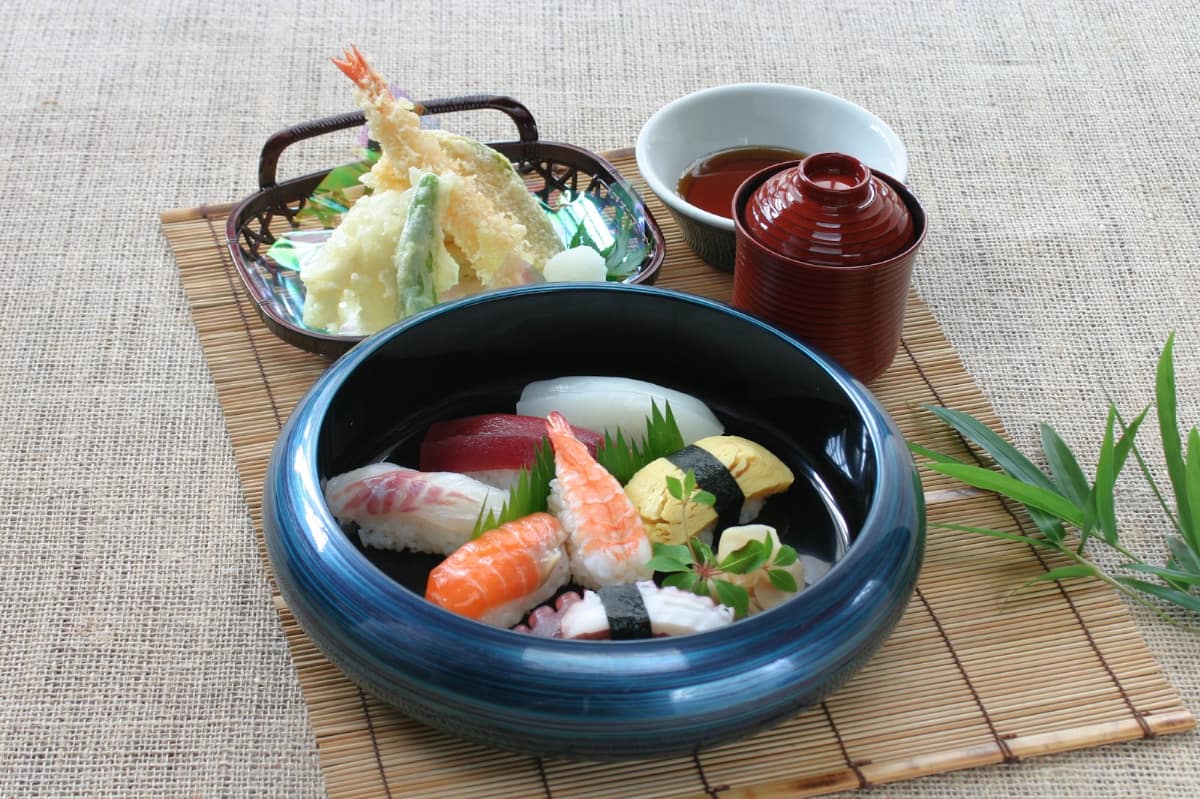ランチ限定の「すし天ぷらセット」(1,155円)は寿司と天ぷらのお膳。素材をそのままに活かしカラッと揚げた天ぷらと、身の引き締まった新鮮な魚が舌を唸らせます。