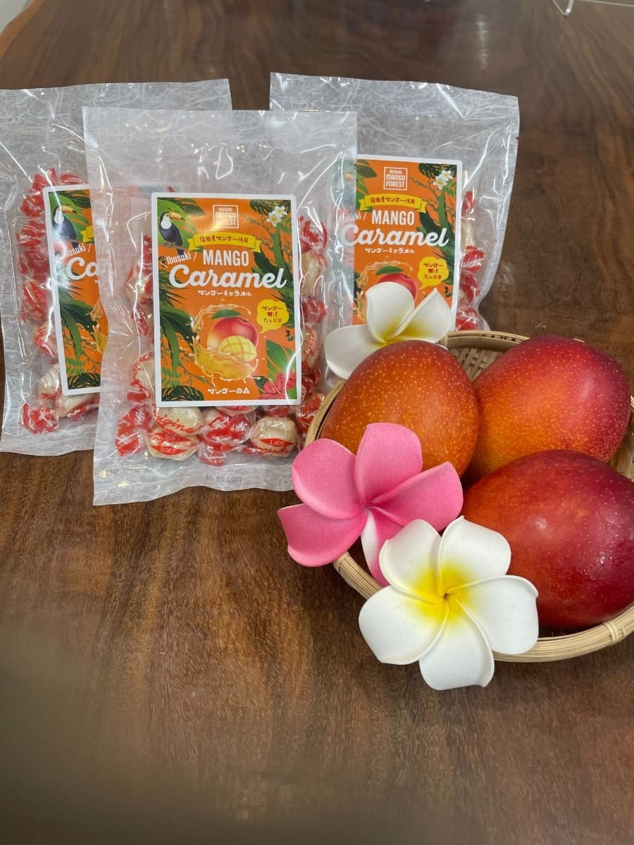 カフェが併設された観光農園「マンゴーの森」で、太陽の光をいっぱい浴びながら育った自家栽培のアップルマンゴーを使用して作られたキャラメルです。爽やかな甘酸っぱさと、濃厚なマンゴーの香りが口いっぱいに広がります。