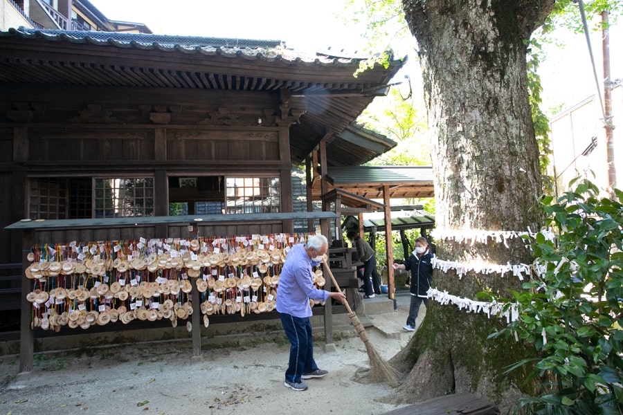 かつては、賽銭を農民や商人に福銭として貸し出し、生活を支えていたことも。神門下で三社めぐりのパンフレット(スタンプ台紙)を入手して各場所に設置されたスタンプを集めると、「福銭(五円玉)」と交換してもらえ、さらなる御利益が期待できます。