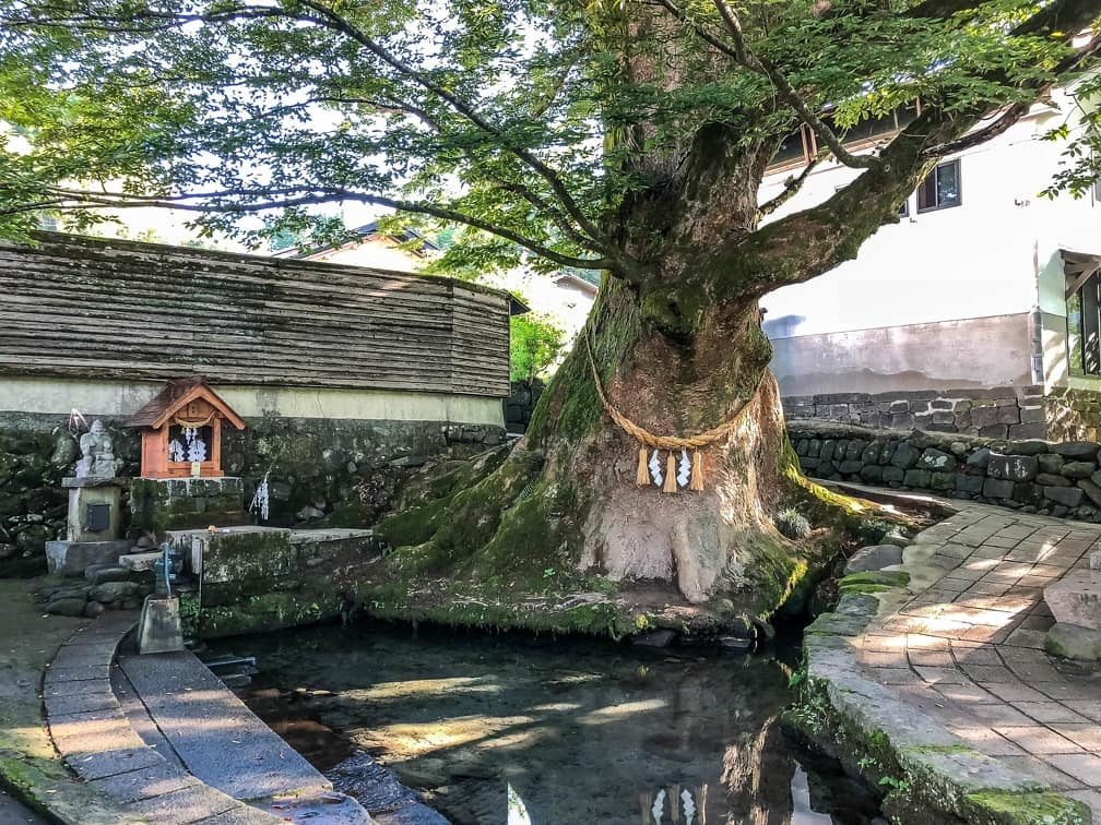 「けやき水源地」は樹齢千年のけやきの根元から湧水した清らかな水源で、ほとりには「開運の水神様」が祀られています。