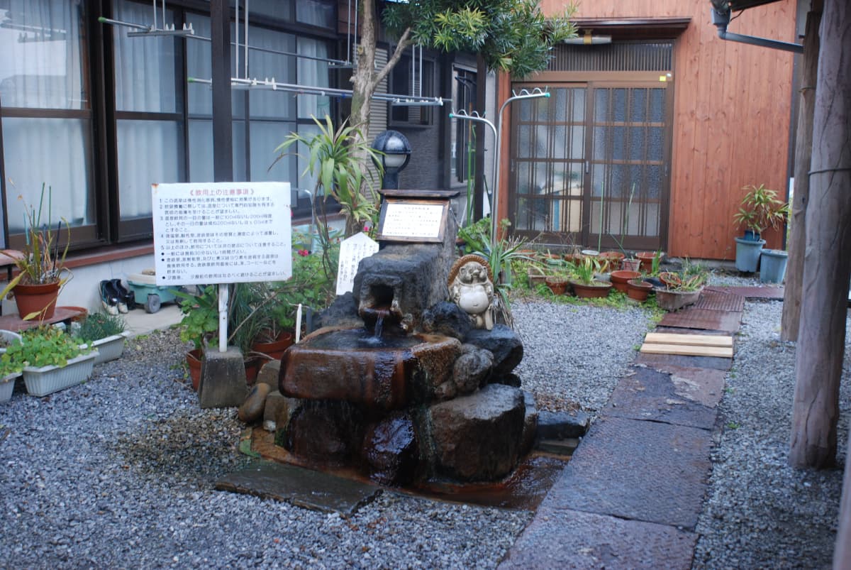 「二月田温泉 殿様湯」の建物の外には、飲用の温泉が用意されています。塩化物泉の飲用では、慢性消化器病・便秘などの効能があります。