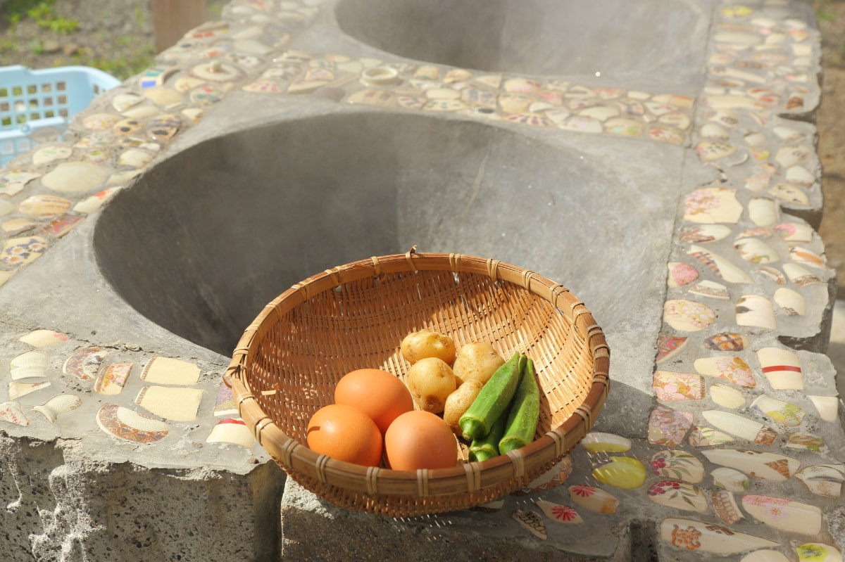温泉の前にある「鰻温泉スメ広場」では、卵や野菜を火山噴気で蒸す料理が体験できます(利用料:300円 ※肉・魚類・タケノコ不可)。卵は5分ほど、じゃがいもなどの根菜類は40分ほどで出来上がり。テーブルがあるので、ホクホクをその場で味わいましょう。