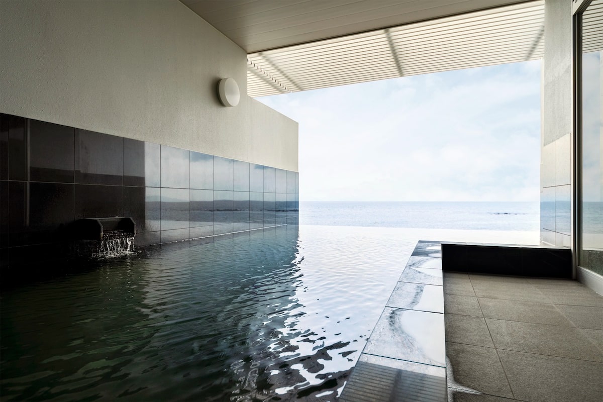 湯船の先が海岸線に向いた露天風呂では、海と湯船が一体化して大海に溶け込んでいくかのような感覚を味わえます。