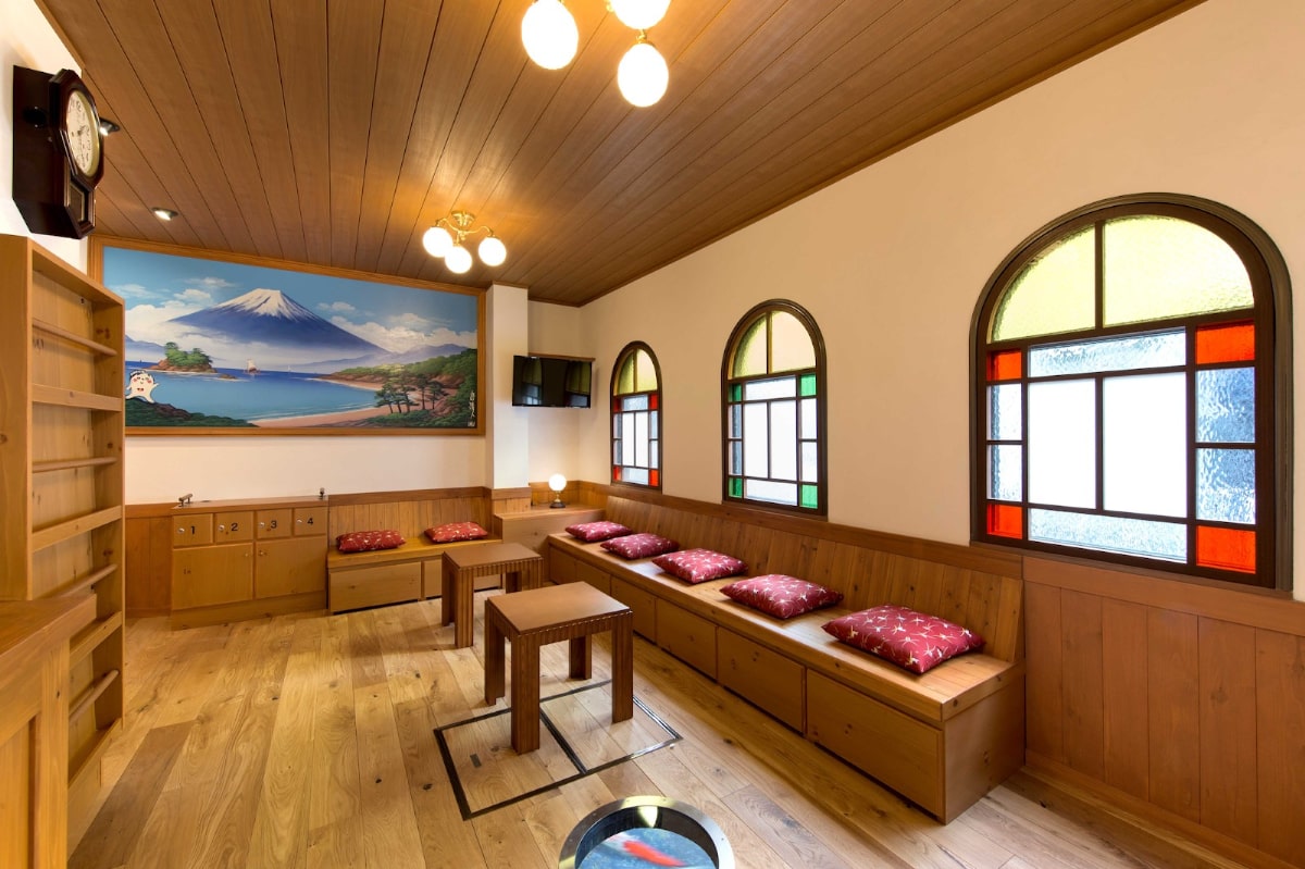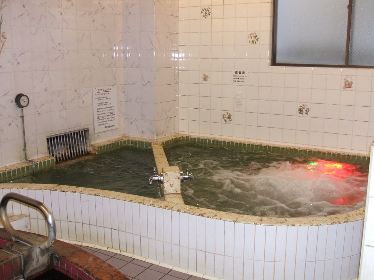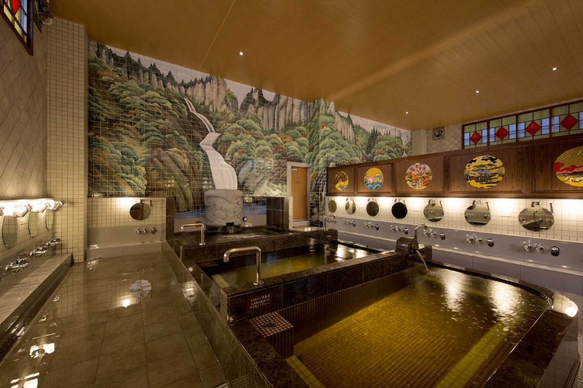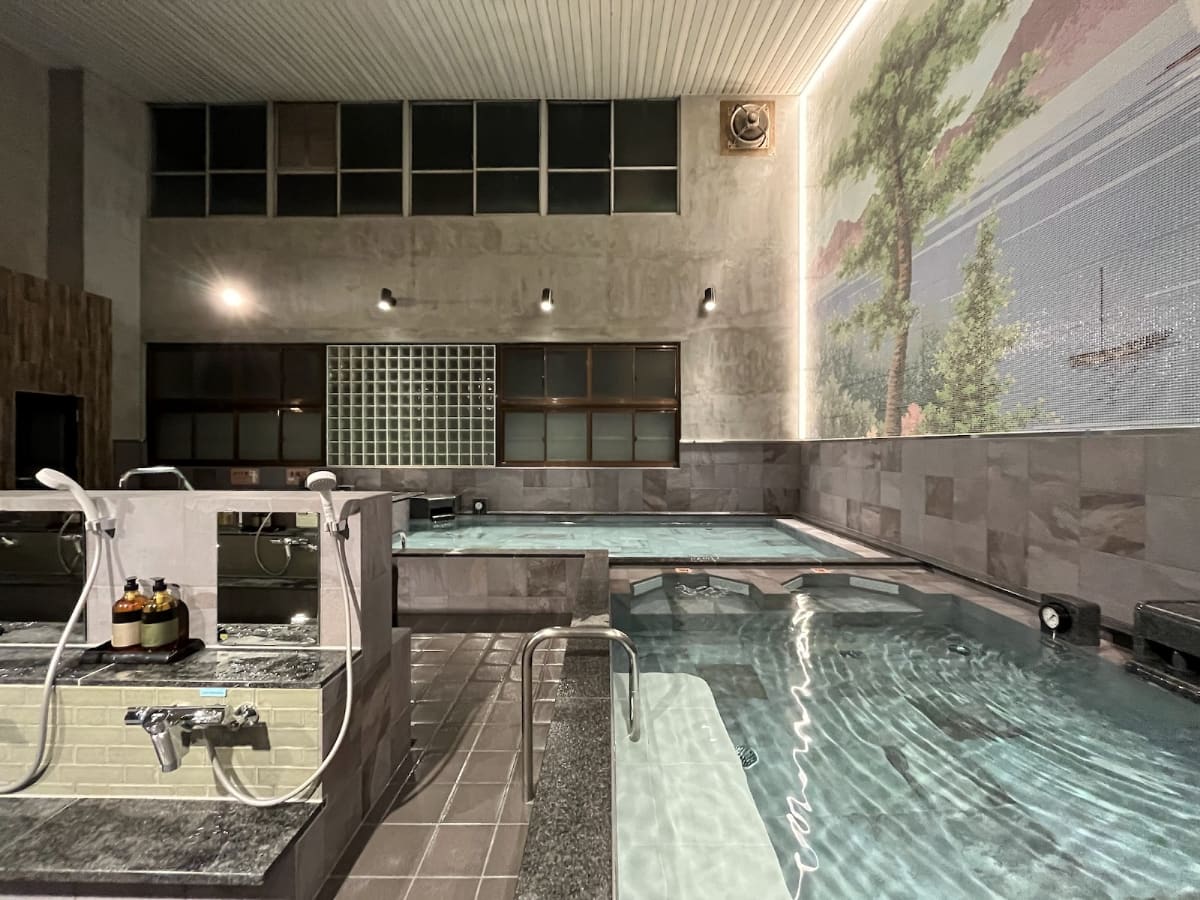 和モダンスタイルのおしゃれな銭湯で、山々が湾を囲む景色のタイル絵を正面に見ながら、炭酸泉や電気風呂付きの熱湯(43~45℃)に浸かれます。